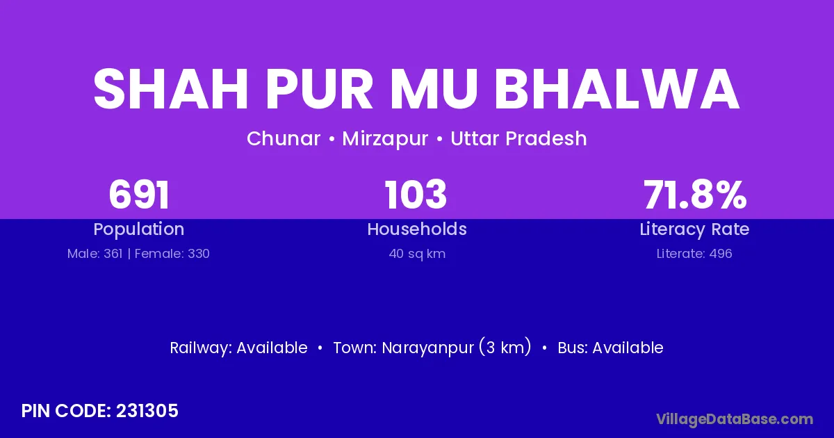 Narayanpur (3 km) is the nearest town to Shah Pur Mu Bhalwa village for major economic activities and is located approximately 3 km away.