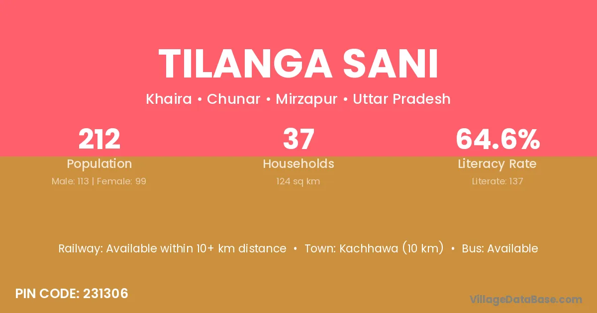 Tilanga Sani village has a total population of 212 people, of which 113 are males and 99 are females.