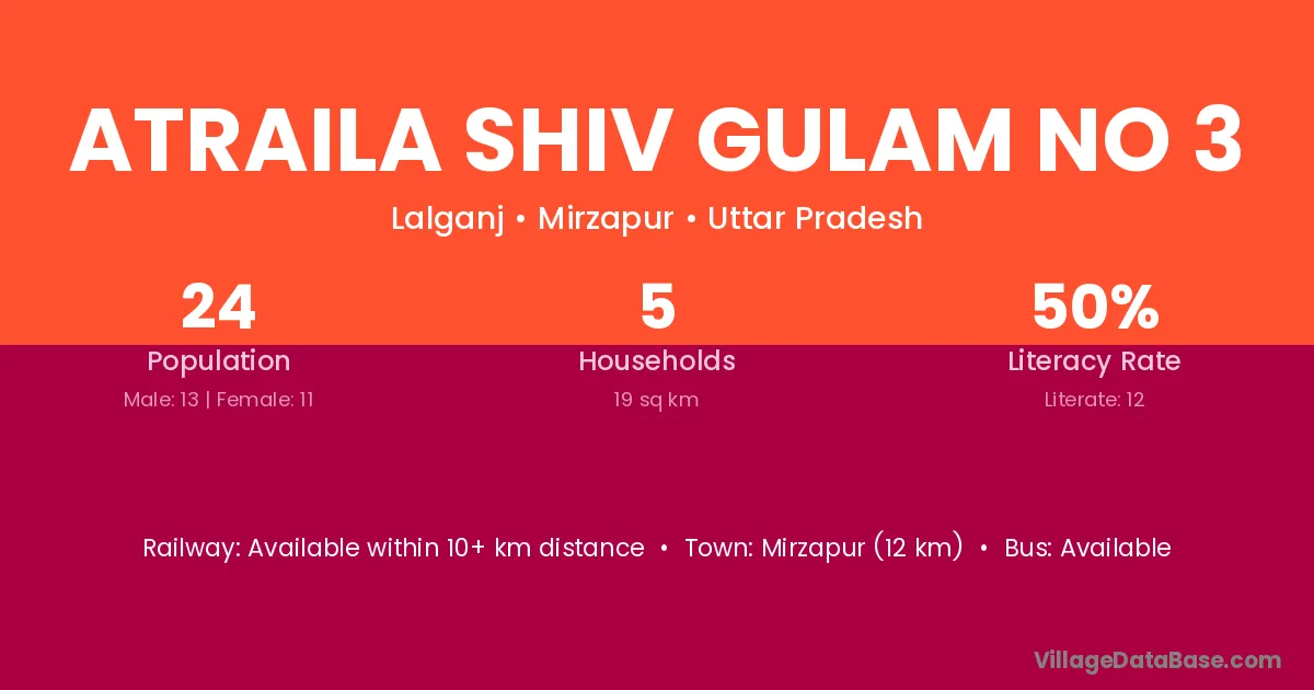 Mirzapur (12 km) is the nearest town to Atraila Shiv Gulam No 3 village for major economic activities and is located approximately 12 km away.