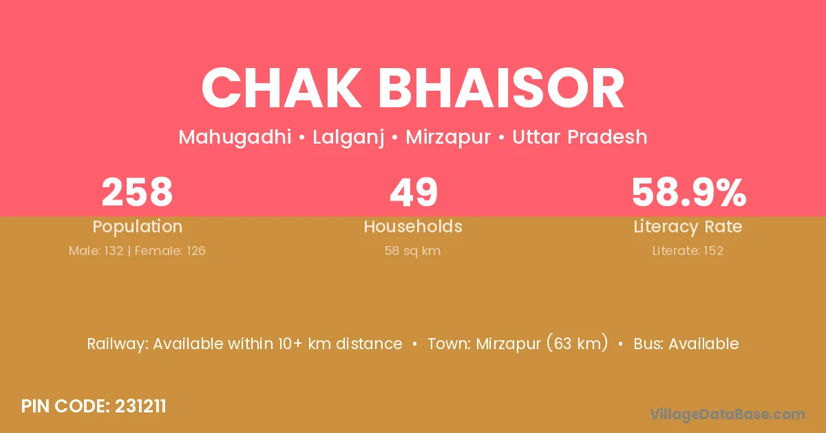 Mirzapur (63 km) is the nearest town to Chak Bhaisor village for major economic activities and is located approximately 63 km away.