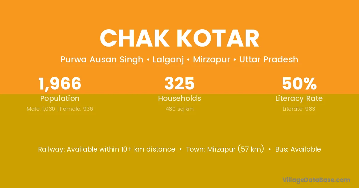 Mirzapur (57 km) is the nearest town to Chak Kotar village for major economic activities and is located approximately 57 km away.