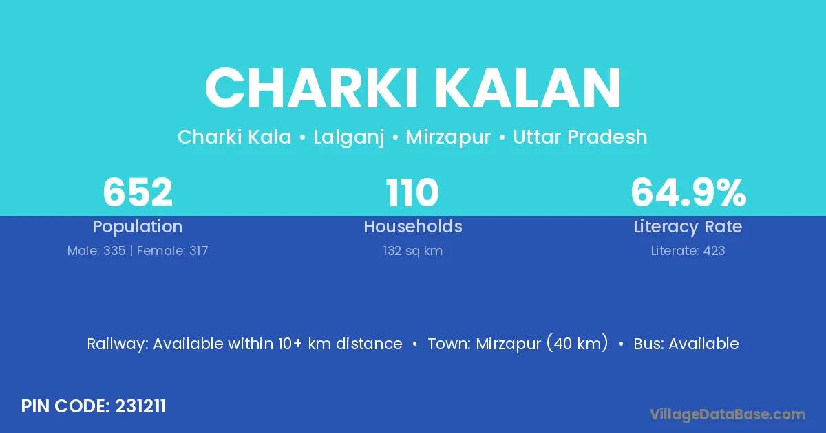 Mirzapur (40 km) is the nearest town to Charki Kalan village for major economic activities and is located approximately 40 km away.