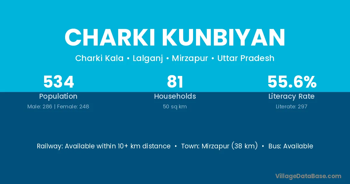 Mirzapur (38 km) is the nearest town to Charki Kunbiyan village for major economic activities and is located approximately 38 km away.
