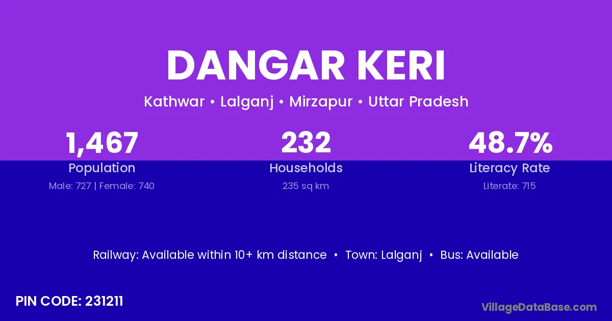Dangar Keri village has a total population of 1,467 people, of which 727 are males and 740 are females.