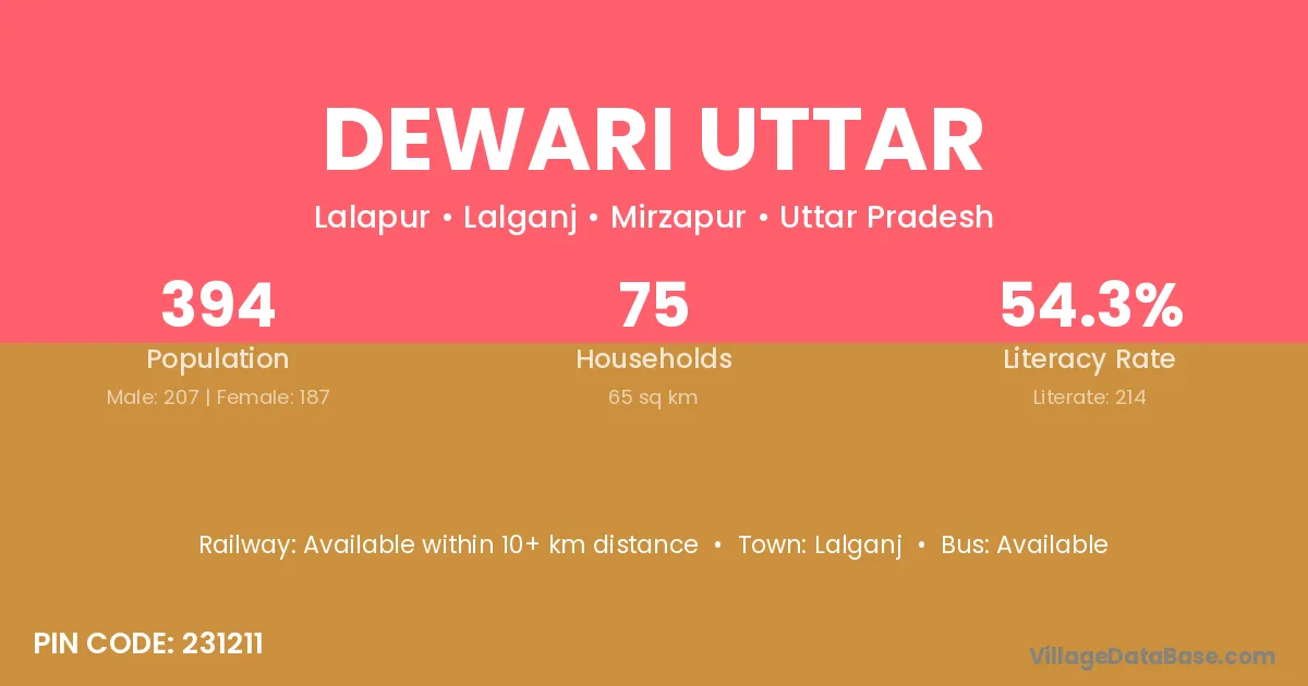 Dewari Uttar village has a total population of 394 people, of which 207 are males and 187 are females.