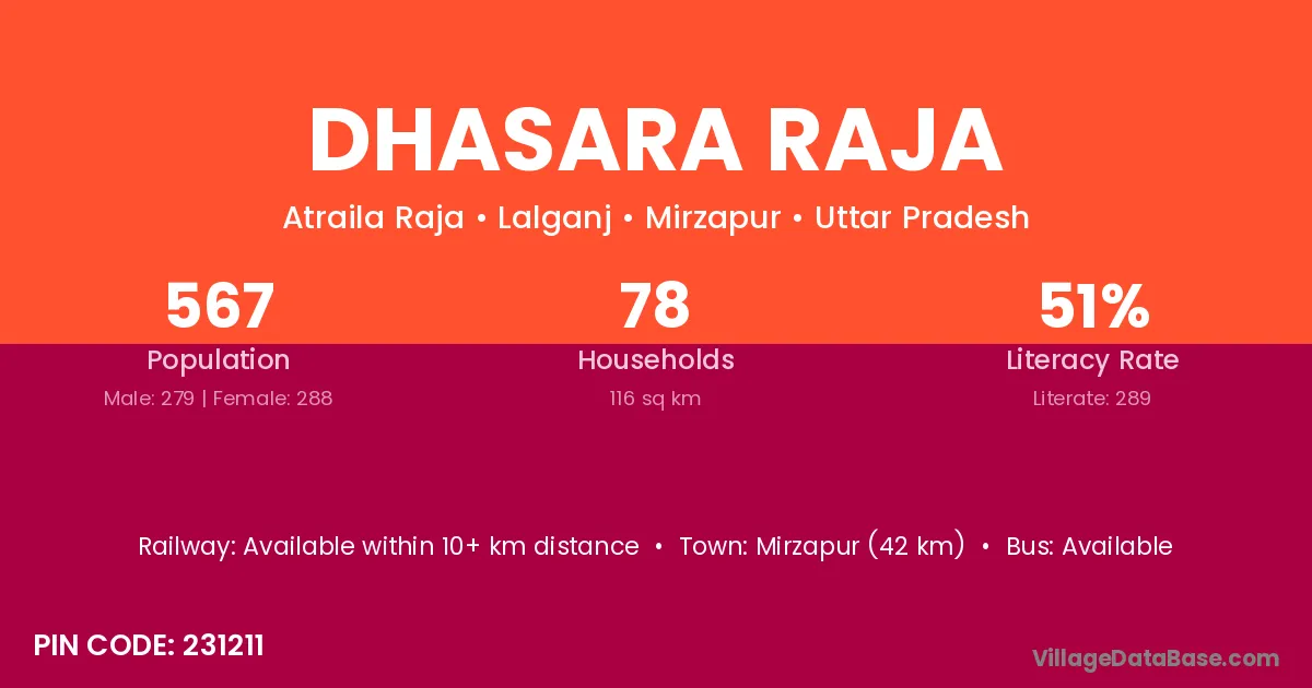 Mirzapur (42 km) is the nearest town to Dhasara Raja village for major economic activities and is located approximately 42 km away.