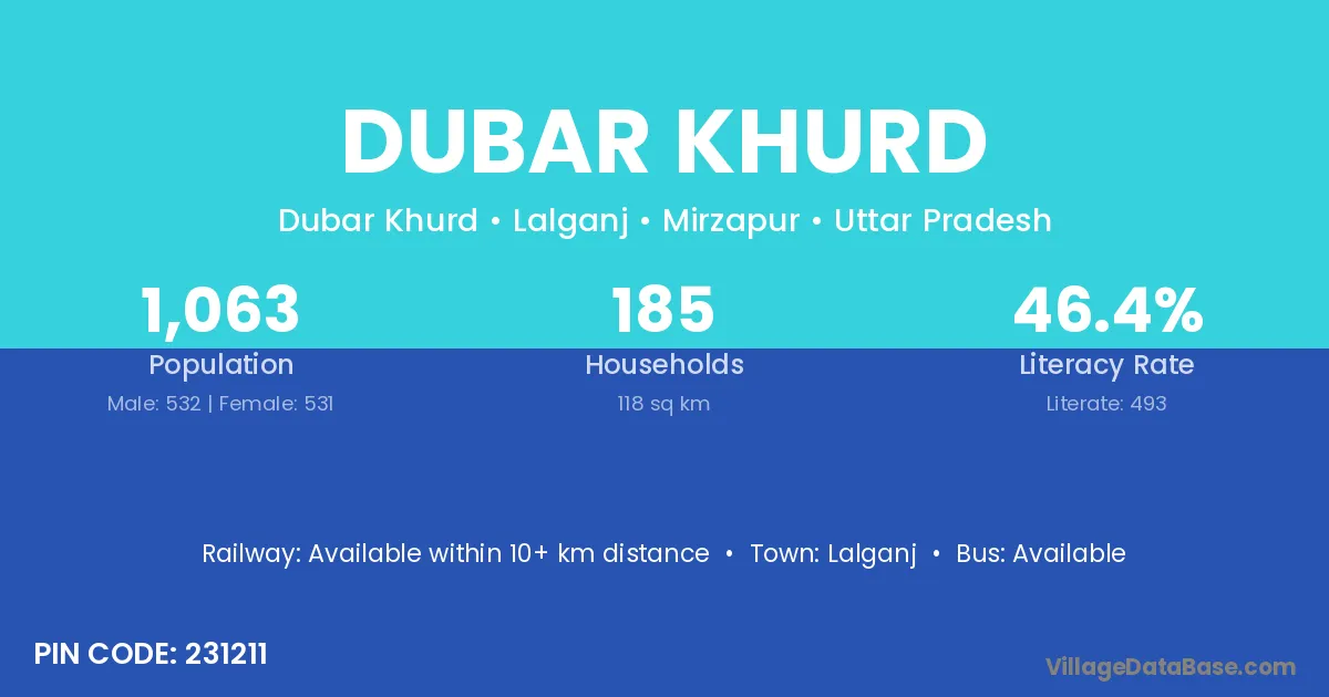 Dubar Khurd village has a total population of 1,063 people, of which 532 are males and 531 are females.