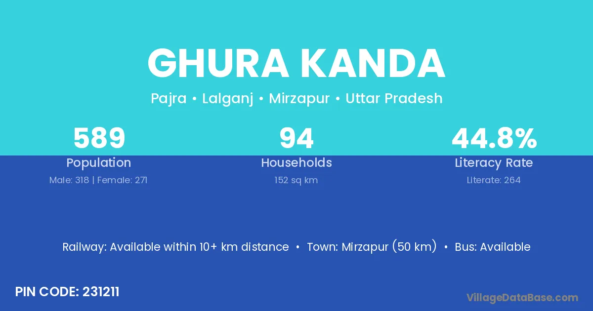 Mirzapur (50 km) is the nearest town to Ghura Kanda village for major economic activities and is located approximately 50 km away.