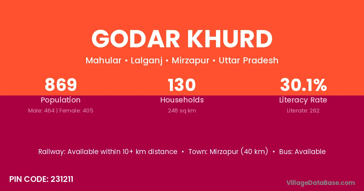 Mirzapur (40 km) is the nearest town to Godar Khurd village for major economic activities and is located approximately 40 km away.