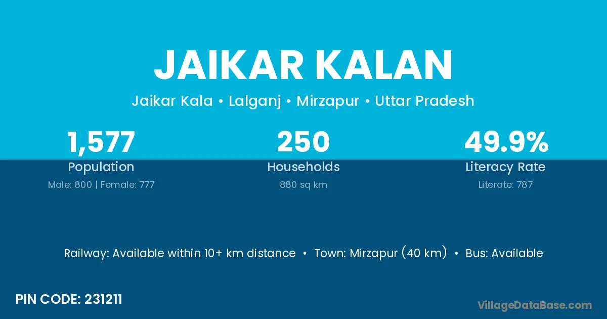 Mirzapur (40 km) is the nearest town to Jaikar Kalan village for major economic activities and is located approximately 40 km away.