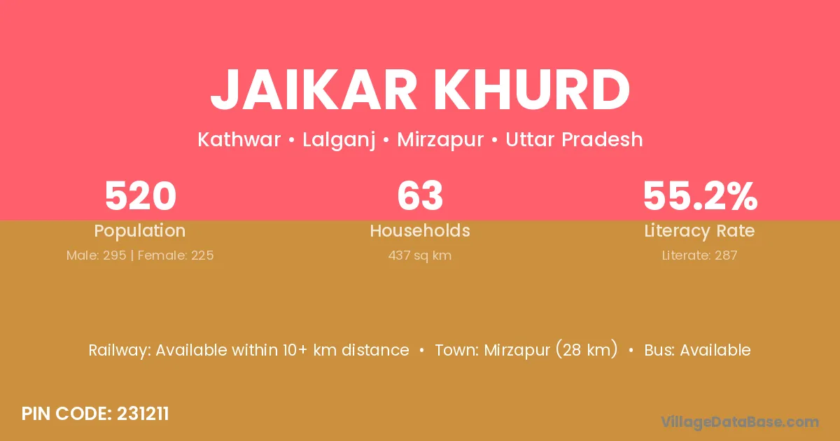 Mirzapur (28 km) is the nearest town to Jaikar Khurd village for major economic activities and is located approximately 28 km away.