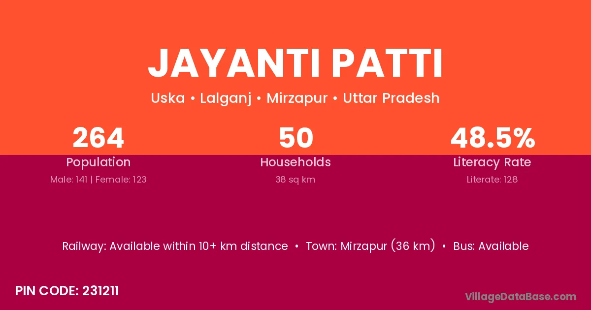 Mirzapur (36 km) is the nearest town to Jayanti Patti village for major economic activities and is located approximately 36 km away.
