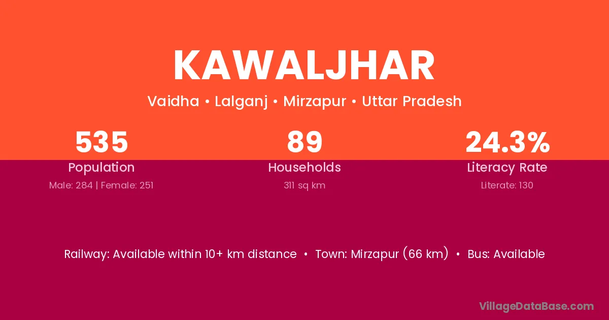 Mirzapur (66 km) is the nearest town to Kawaljhar village for major economic activities and is located approximately 66 km away.