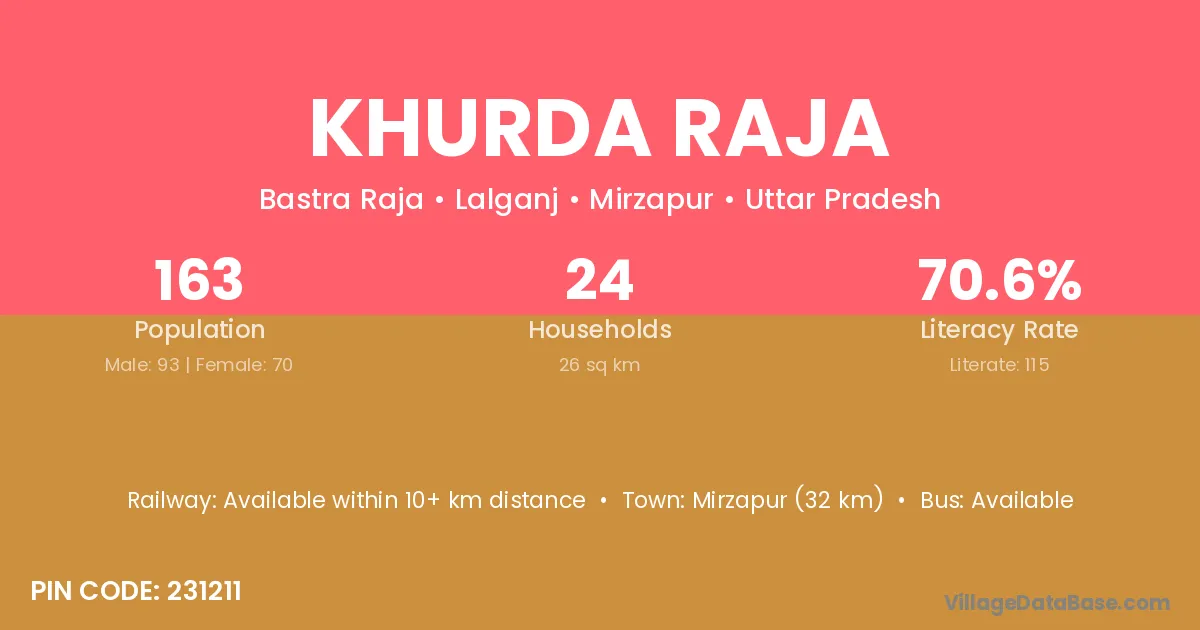 Mirzapur (32 km) is the nearest town to Khurda Raja village for major economic activities and is located approximately 32 km away.