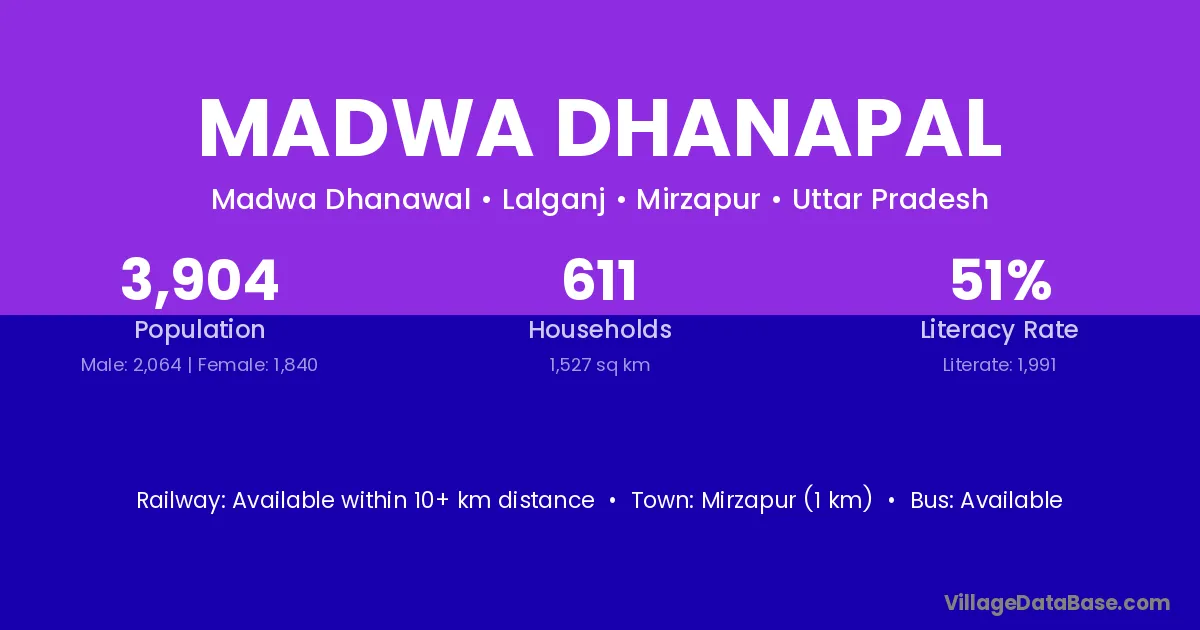 Mirzapur (1 km) is the nearest town to Madwa Dhanapal village for major economic activities and is located approximately 1 km away.