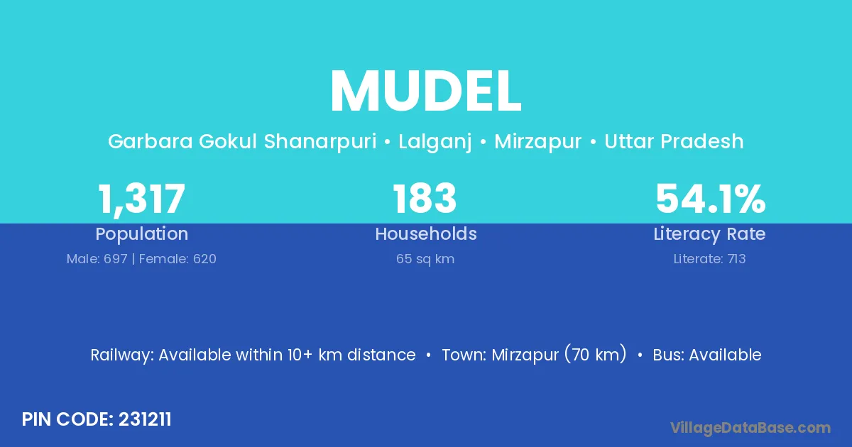 Mirzapur (70 km) is the nearest town to Mudel village for major economic activities and is located approximately 70 km away.
