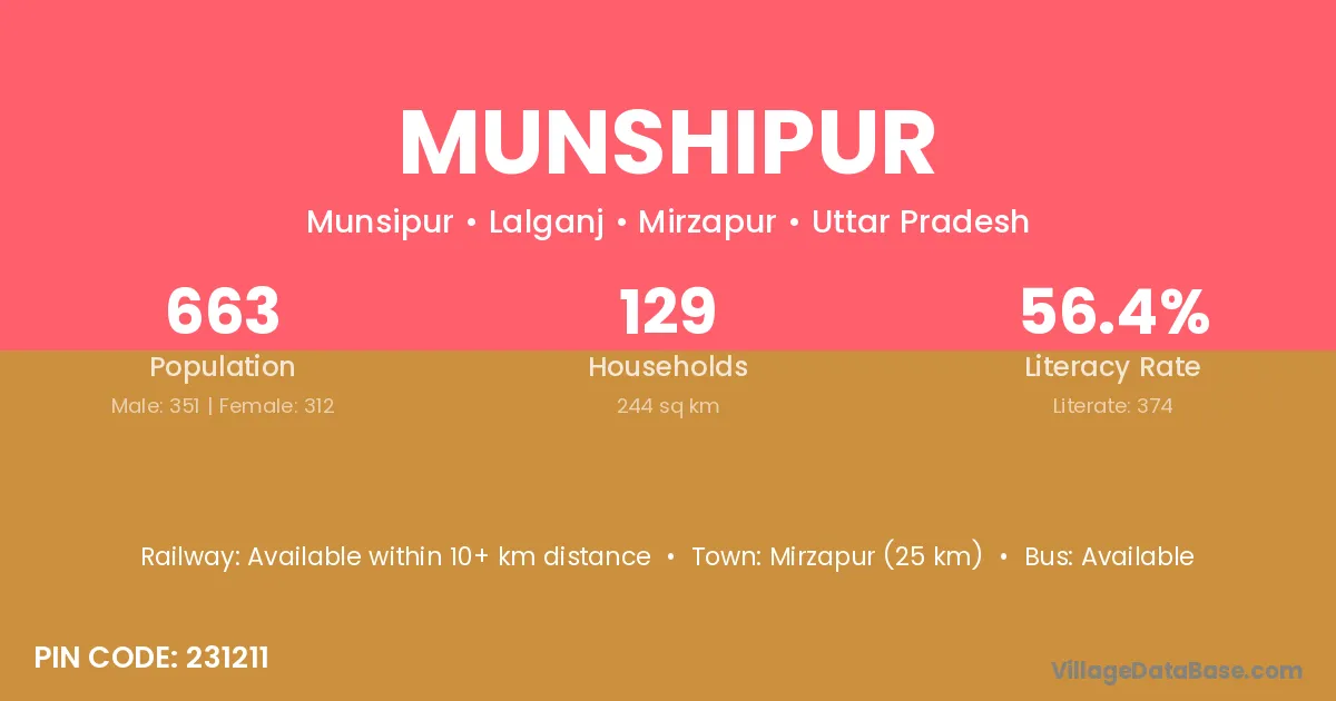 Mirzapur (25 km) is the nearest town to Munshipur village for major economic activities and is located approximately 25 km away.