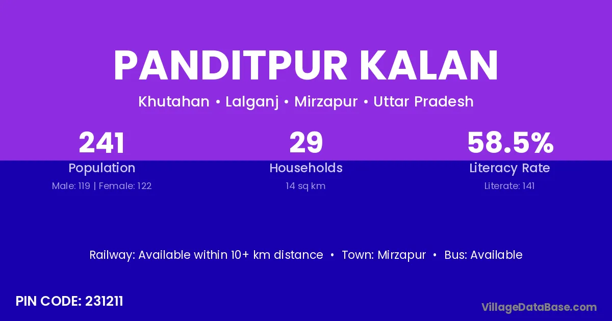 Panditpur Kalan village has a total population of 241 people, of which 119 are males and 122 are females.
