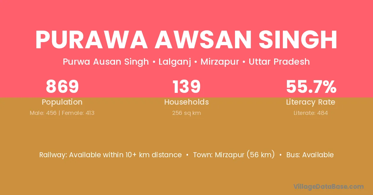 Purawa Awsan Singh village has a total population of 869 people, of which 456 are males and 413 are females.