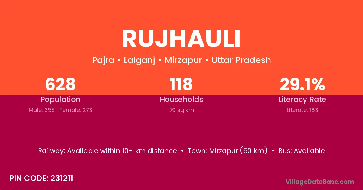 Mirzapur (50 km) is the nearest town to Rujhauli village for major economic activities and is located approximately 50 km away.