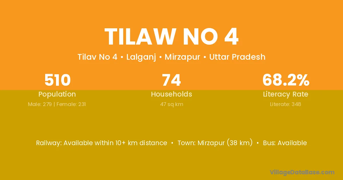 Tilaw No 4 village has a total population of 510 people, of which 279 are males and 231 are females.