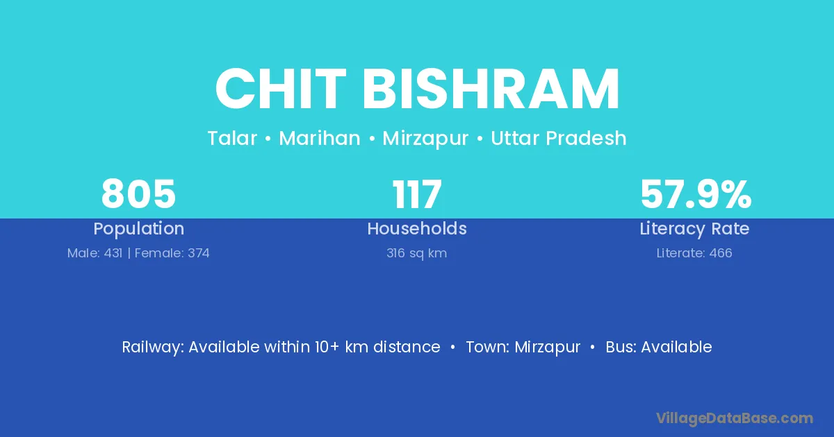 Chit Bishram village has a total population of 805 people, of which 431 are males and 374 are females.