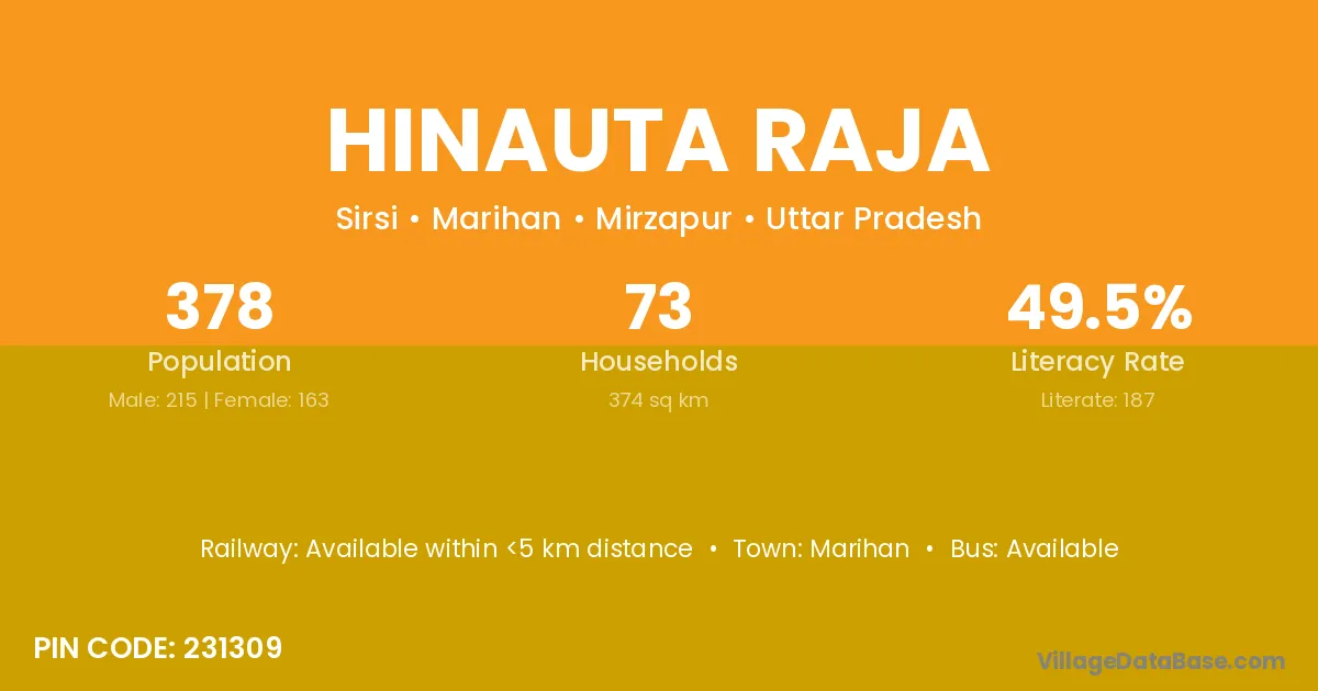 Hinauta Raja village has a total population of 378 people, of which 215 are males and 163 are females.