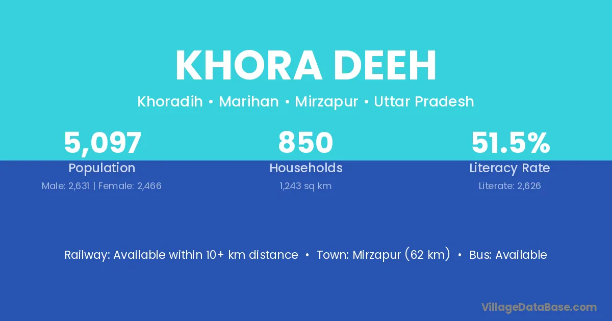 Mirzapur (62 km) is the nearest town to Khora Deeh village for major economic activities and is located approximately 62 km away.