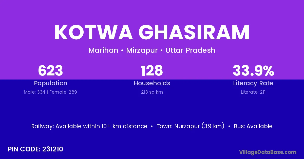Nurzapur (39 km) is the nearest town to Kotwa Ghasiram village for major economic activities and is located approximately 39 km away.
