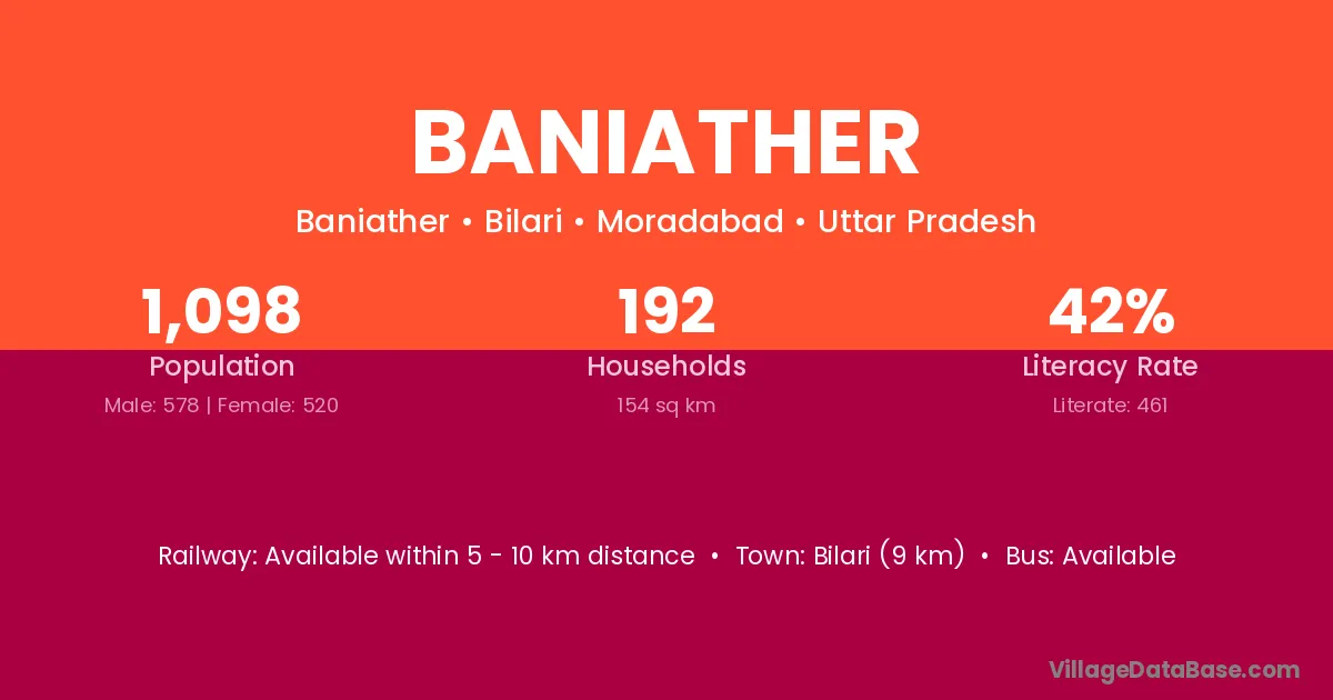 Bilari (9 km) is the nearest town to Baniather village for major economic activities and is located approximately 9 km away.