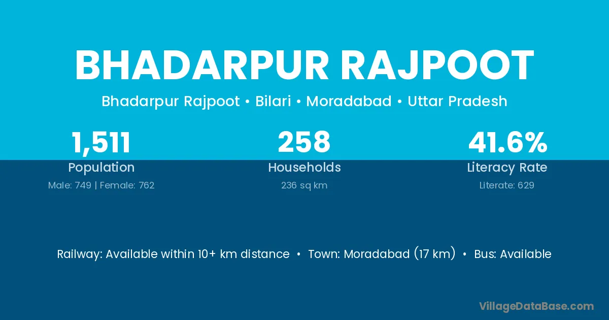 Moradabad (17 km) is the nearest town to Bhadarpur Rajpoot village for major economic activities and is located approximately 17 km away.