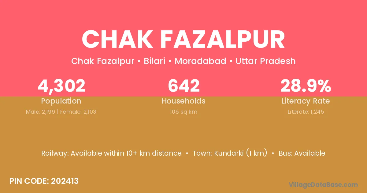 Kundarki (1 km) is the nearest town to Chak Fazalpur village for major economic activities and is located approximately 1 km away.