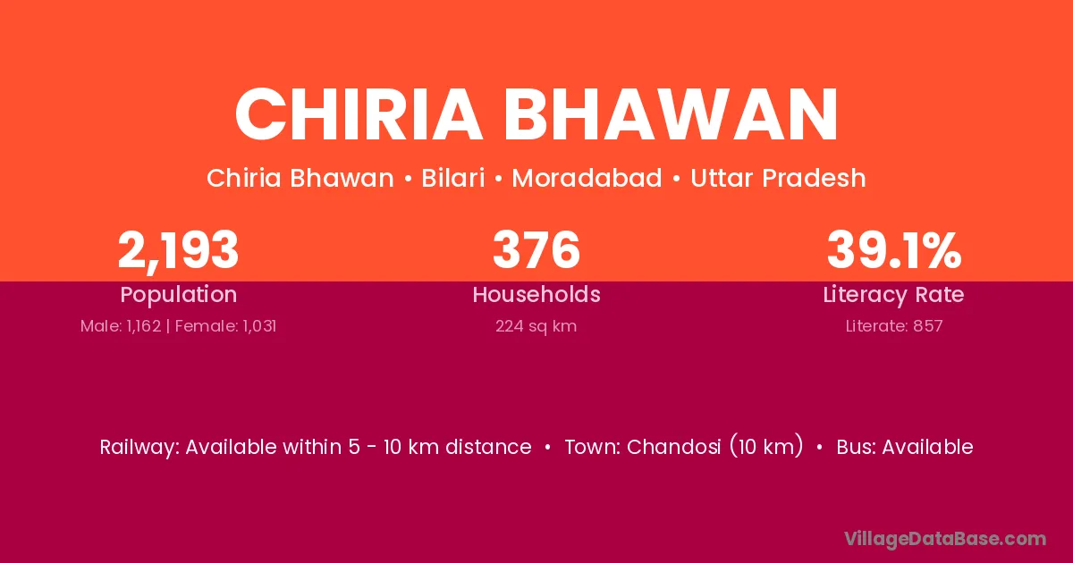 Chiria Bhawan village has a total population of 2,193 people, of which 1,162 are males and 1,031 are females.