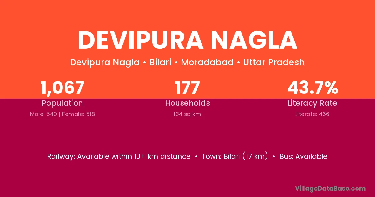 Bilari (17 km) is the nearest town to Devipura Nagla village for major economic activities and is located approximately 17 km away.