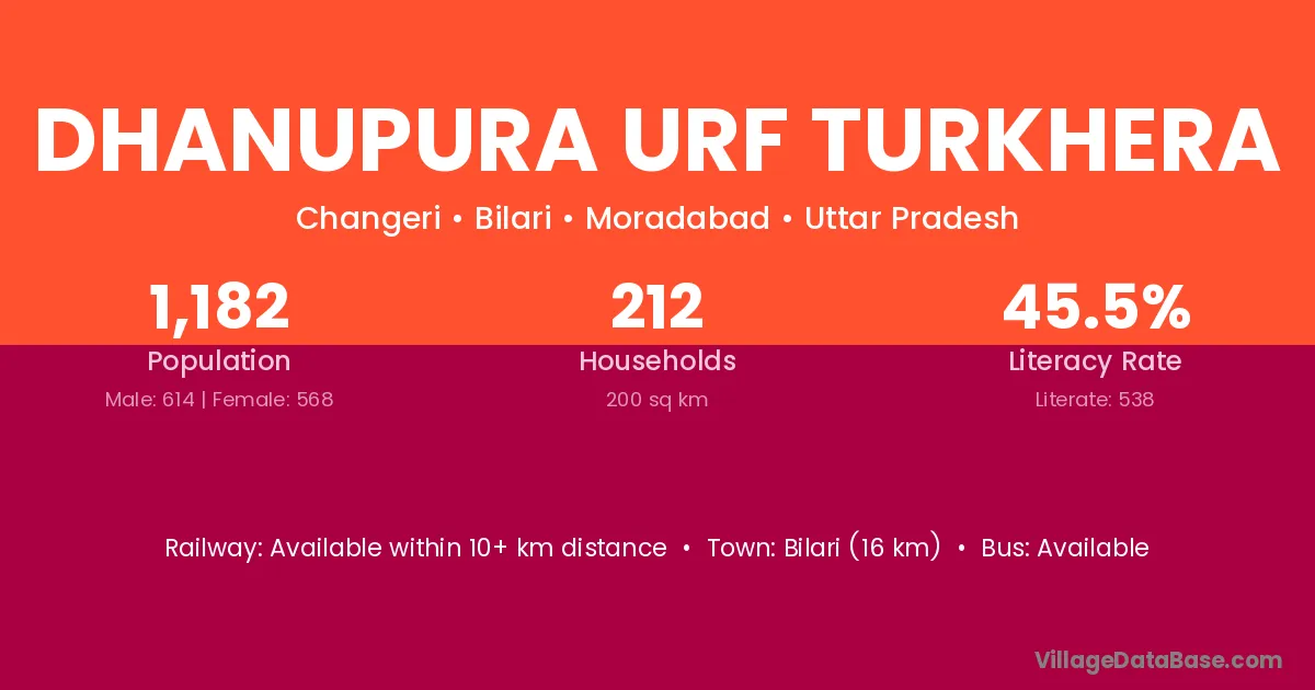 Dhanupura Urf Turkhera village has a total population of 1,182 people, of which 614 are males and 568 are females.
