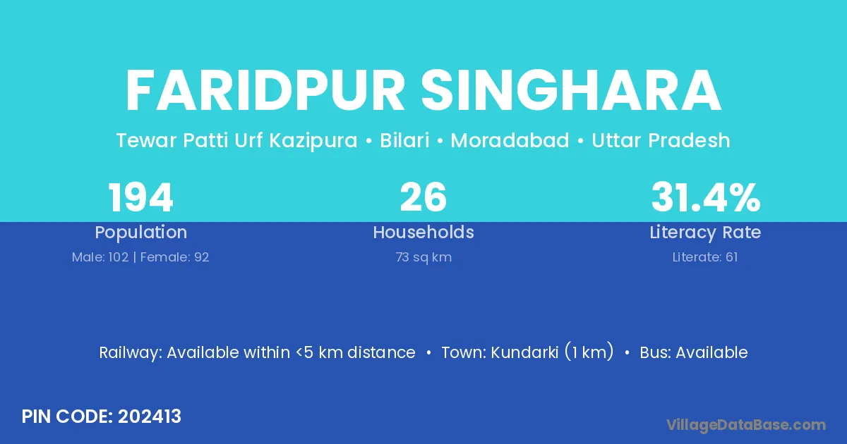 Kundarki (1 km) is the nearest town to Faridpur Singhara village for major economic activities and is located approximately 1 km away.