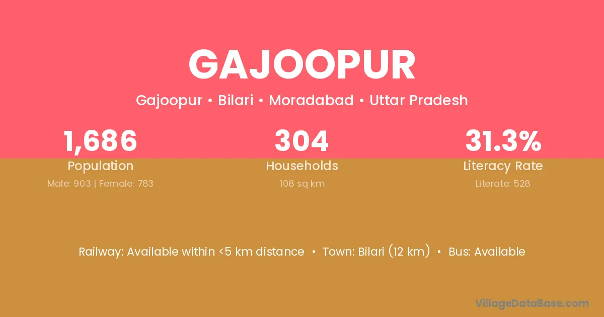 Bilari (12 km) is the nearest town to Gajoopur village for major economic activities and is located approximately 12 km away.