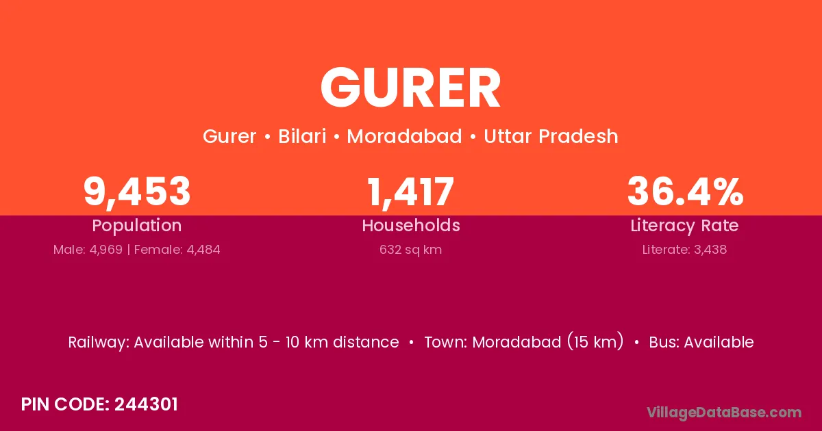Moradabad (15 km) is the nearest town to Gurer village for major economic activities and is located approximately 15 km away.