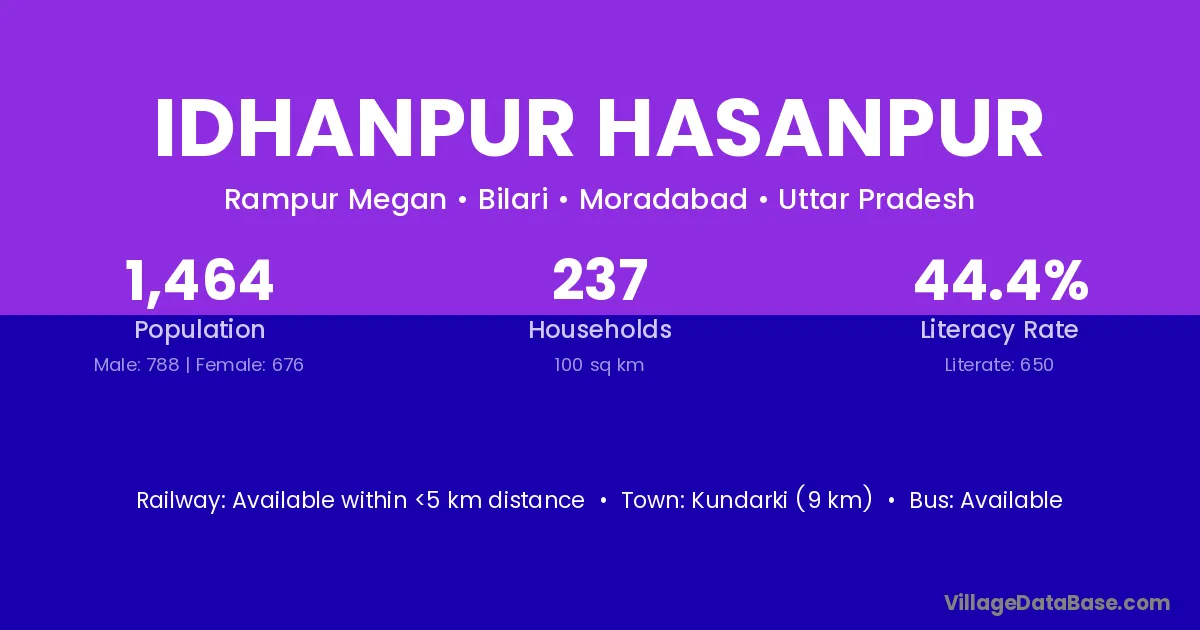 Kundarki (9 km) is the nearest town to Idhanpur Hasanpur village for major economic activities and is located approximately 9 km away.