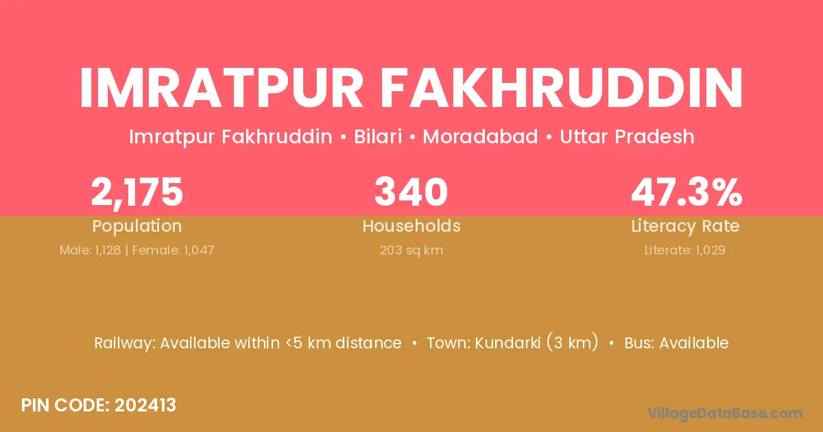 Kundarki (3 km) is the nearest town to Imratpur Fakhruddin village for major economic activities and is located approximately 3 km away.
