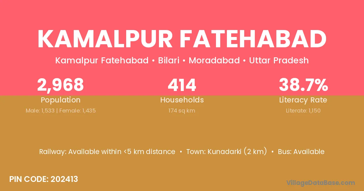 Kunadarki (2 km) is the nearest town to Kamalpur Fatehabad village for major economic activities and is located approximately 2 km away.