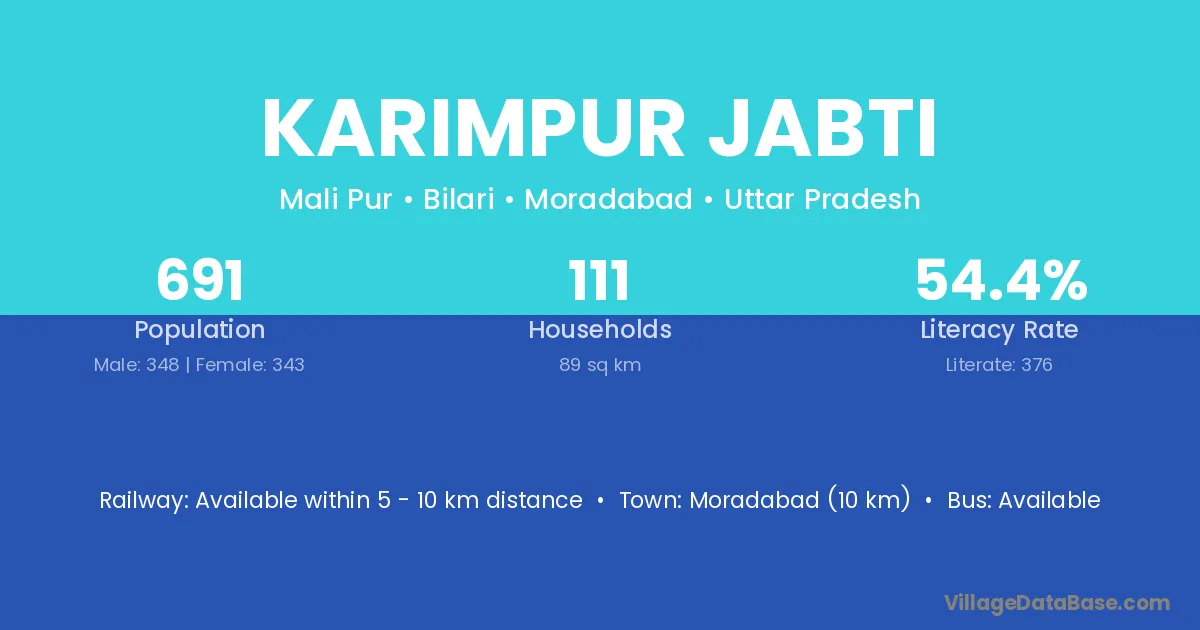 Moradabad (10 km) is the nearest town to Karimpur Jabti village for major economic activities and is located approximately 10 km away.