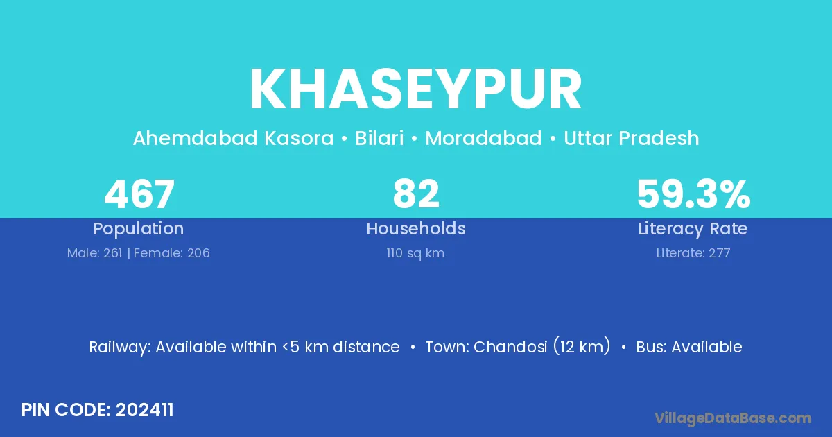 Chandosi (12 km) is the nearest town to Khaseypur village for major economic activities and is located approximately 12 km away.