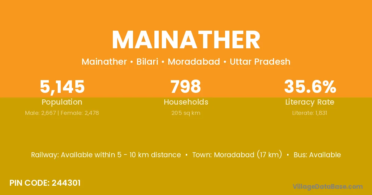 Moradabad (17 km) is the nearest town to Mainather village for major economic activities and is located approximately 17 km away.