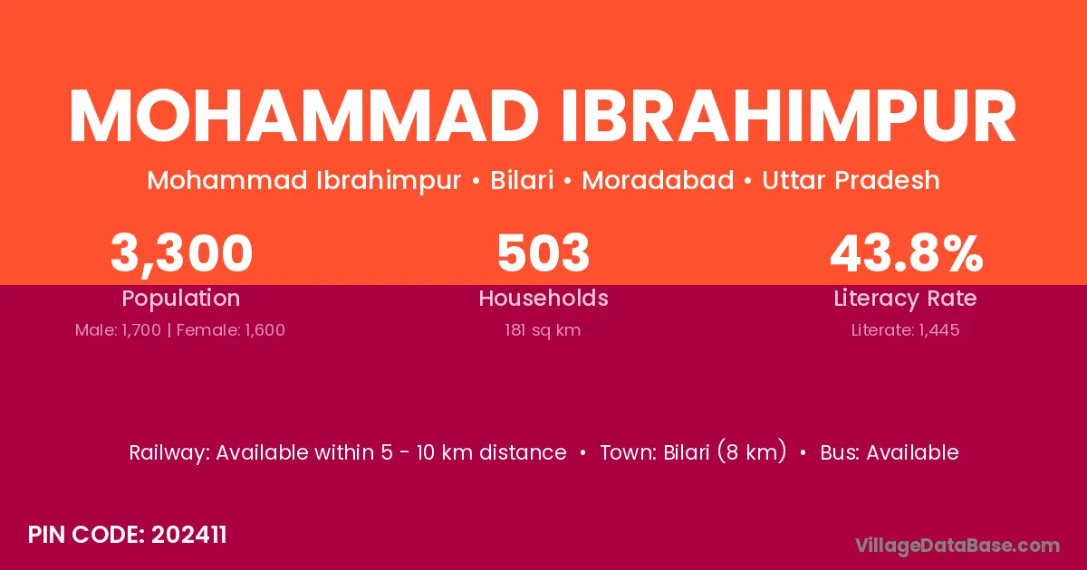 Mohammad Ibrahimpur village has a total population of 3,300 people, of which 1,700 are males and 1,600 are females.