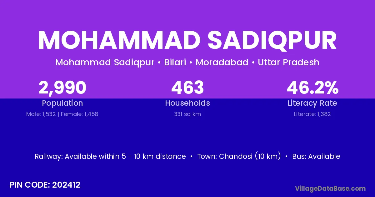 Chandosi (10 km) is the nearest town to Mohammad Sadiqpur village for major economic activities and is located approximately 10 km away.