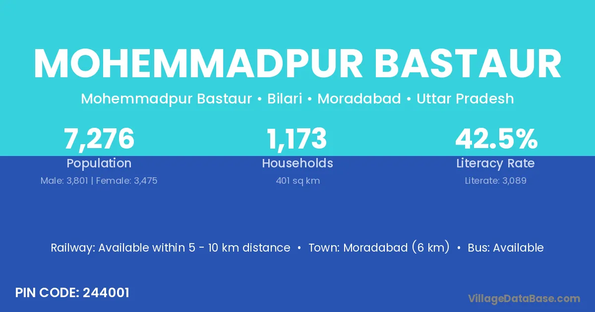 Moradabad (6 km) is the nearest town to Mohemmadpur Bastaur village for major economic activities and is located approximately 6 km away.