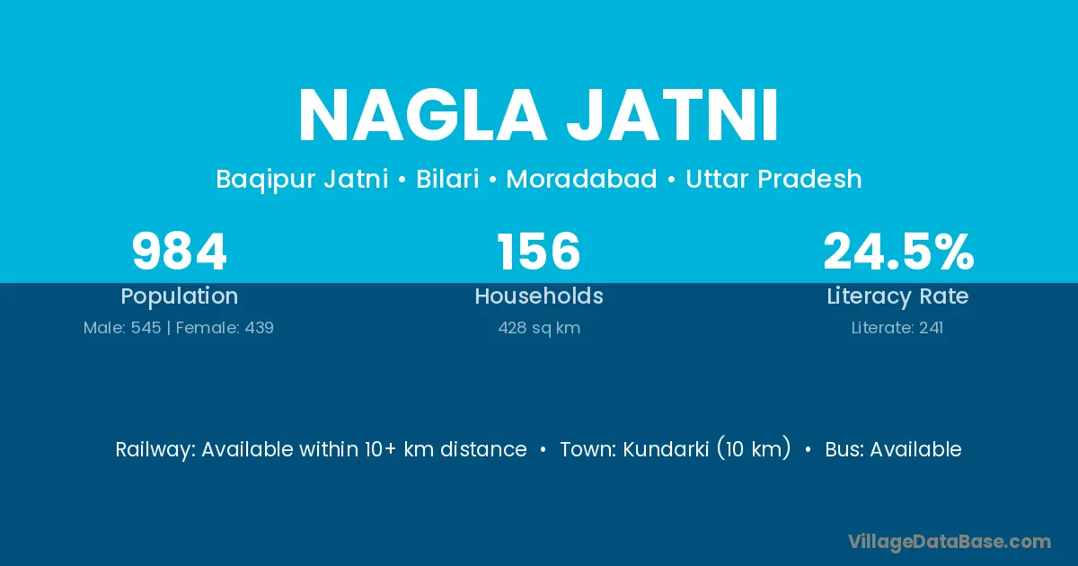 Kundarki (10 km) is the nearest town to Nagla Jatni village for major economic activities and is located approximately 10 km away.