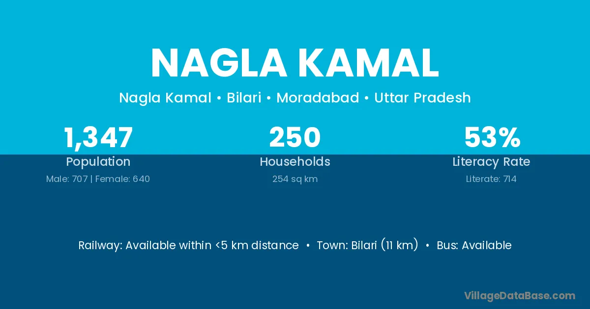 Bilari (11 km) is the nearest town to Nagla Kamal village for major economic activities and is located approximately 11 km away.