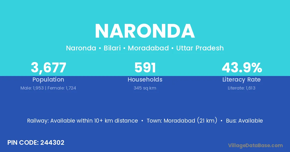 Moradabad (21 km) is the nearest town to Naronda village for major economic activities and is located approximately 21 km away.